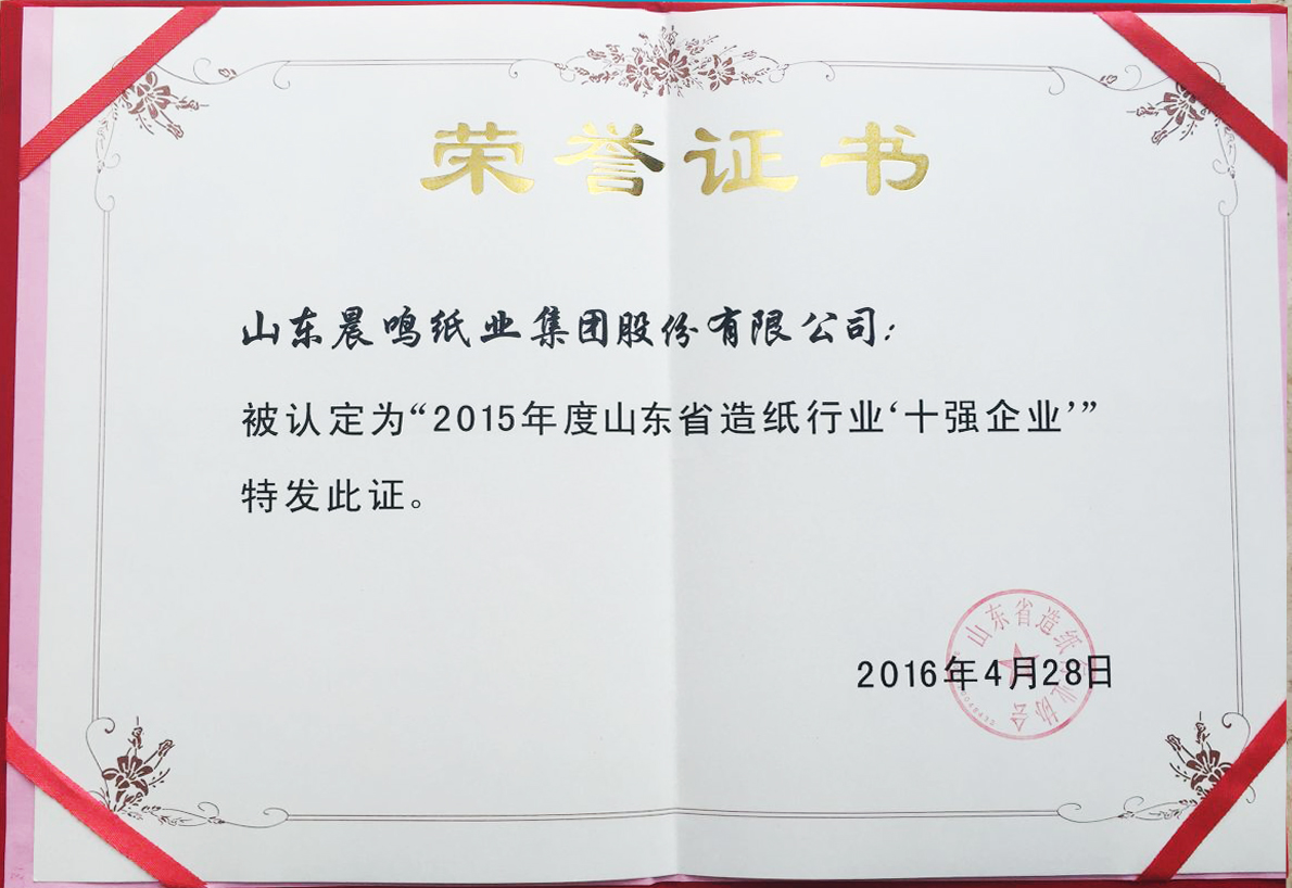 2012/4 在兖州召开的山东省造纸行业协会五届三次会员代表大会暨全省造纸行业会议上,公布了2011年度山东造纸行业“十强企业”名单,我公司位列榜首。