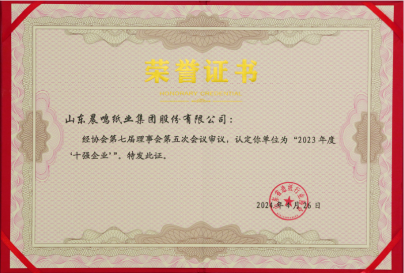 2013/5/28 中国造纸协会第三届理事会第五次扩大会议在武汉召开,会上公布了由中国轻工业联合会 ,中国造纸协会评选的2012年度“中国轻工业造纸业十强企业”榜单,晨鸣位列其中。