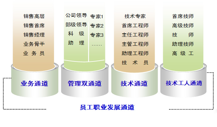 鼓励、支持和引导员工努力提升专业技能,通过专业技能的提升实现职级的发展。专业技能的提升可通过以下几种途径:自我开发学习、在职培训、企业内训、送外脱产培训等。员工可根据自身的需要结合企业的实际情况选择一种或多种途径实现专业技能的提升。